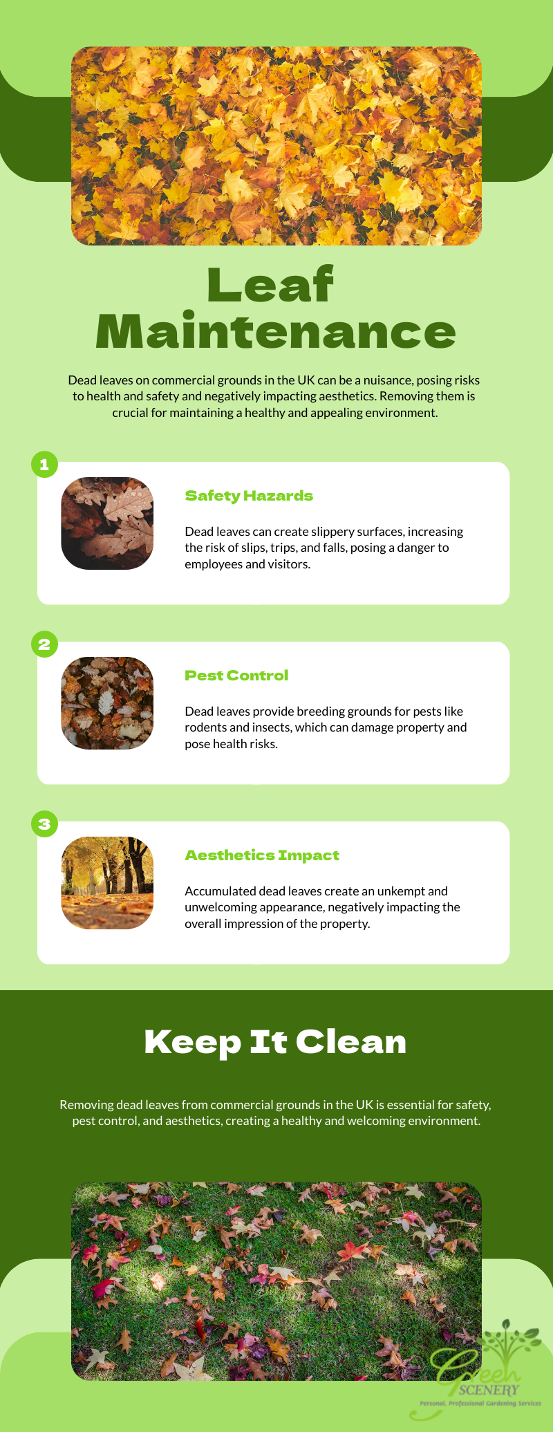 One of the main reasons why leaf maintenance is important is for safety. When leaves fall from the trees and gather on paths or lawns, they become very wet, and create a slippery surface that can increase the risk of slips, trips and falls. For commercial or residential properties with grounds, the fallen leaves can become a liability, risking your compliance to health and safety standards and regulations. As a result, regular removal of leaves, especially from paths and walkways, is essential for any business in the autumn months. A professional team like ours here at Green Scenery, will keep on top of your leaf maintenance to ensure that your property is safe for customers, clients and staff, all year round.